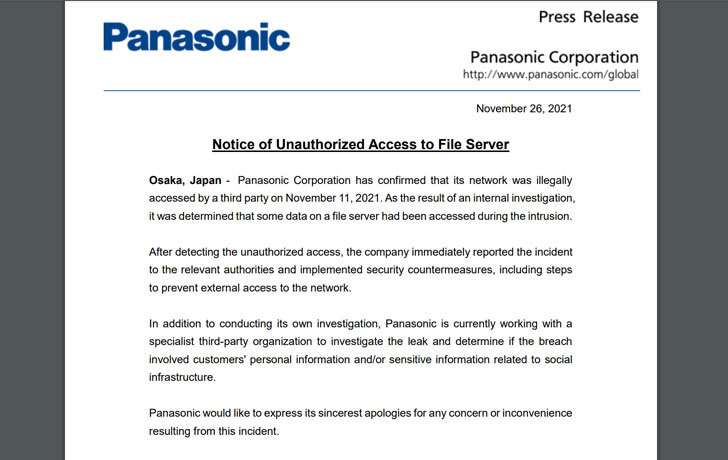 Japanese consumer electronics giant Panasonic has disclosed a security breach wherein an unauthorized third-party broke into its network and potentially accessed data from one of its file servers.