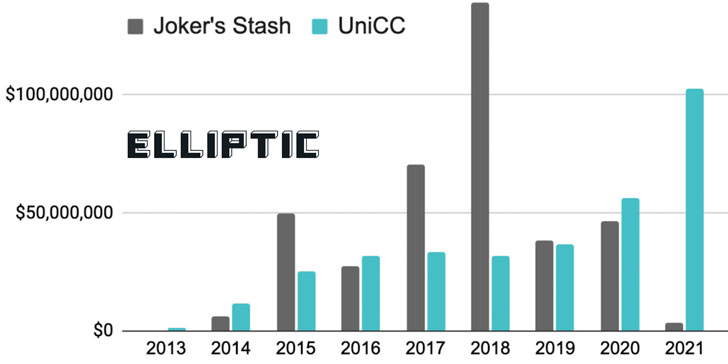 The sunsetting comes exactly a year after Joker’s Stash, the previous market leader, announced its retirement in January 2021 after having facilitated the sale of nearly $400 million in stolen cards. The demise of Joker’s Stash worked to UniCC’s benefit, which quickly snapped up the top spot with a 30% market share, the researchers noted.