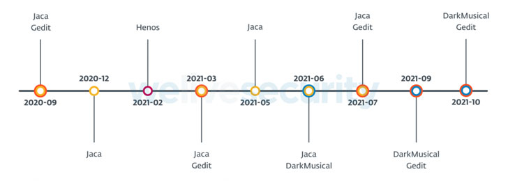ESET dubbed the new variants of yty, DarkMusical and Gedit, with telemetry data pointing to attacks from a third variant called Jaca from March to July 2021. The first wave of attacks using DarkMusical is said to have occurred in June 2021, while Gedit-related campaigns were observed as early as September 2020, only to pick up the pace a year later.