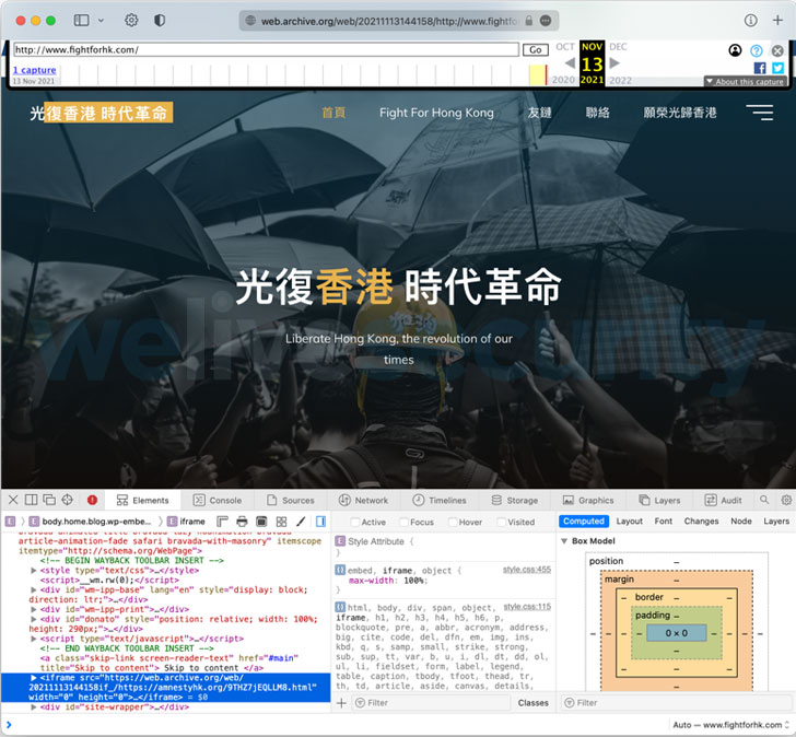 The attack chain involved compromising a legitimate website belonging to D100 Radio, a pro-democracy internet radio station in Hong Kong, to inject malicious inline frames (aka iframes) between September 30 and November 4, 2021.
