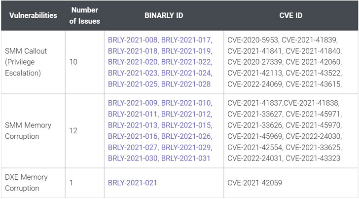 Successful exploitation of the flaws (CVSS scores: 7.5 – 8.2) could allow a malicious actor to run arbitrary code with SMM permissions, a special-purpose execution mode in x86-based processors that handles power management, hardware configuration, thermal monitoring, and other functions.