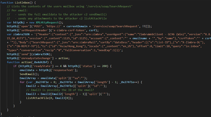 The espionage operation — codenamed “EmailThief” — was detailed by cybersecurity company Volexity in a technical report published Thursday, noting that successful exploitation of the cross-site scripting (XSS) vulnerability could result in the execution of arbitrary JavaScript code in the context of the user’s Zimbra session.