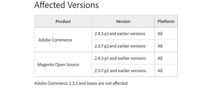 The flaw affects Adobe Commerce and Magento Open Source 2.4.3-p1 and earlier versions as well as 2.3.7-p2 and earlier versions. Adobe Commerce 2.3.3 and lower are not vulnerable.