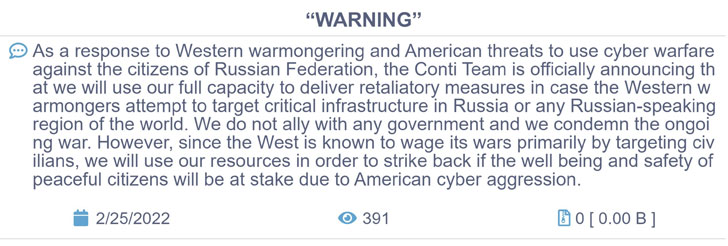 The group, however, later rephrased its statement to state that “we do not ally with any government and we condemn the ongoing war.” But Conti Team also maintained that it “will use our full capacity to deliver retaliatory measures in case the Western warmongers attempt to target critical infrastructure in Russia or any Russian-speaking region of the world.”