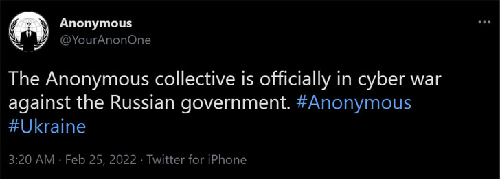 “The Anonymous collective is officially in cyber war against the Russian government,” the decentralized hacktivist group tweeted, adding it “leaked the database of the Russian Ministry of Defense website.”