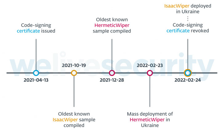 “This is based on several facts: the HermeticWiper PE compilation timestamps, the oldest being December 28, 2021; the code-signing certificate issue date of April 13, 2021; and the deployment of HermeticWiper through the default domain policy in at least one instance, suggesting the attackers had prior access to one of that victim’s Active Directory servers,” said Jean-Ian Boutin, ESET head of threat research.
