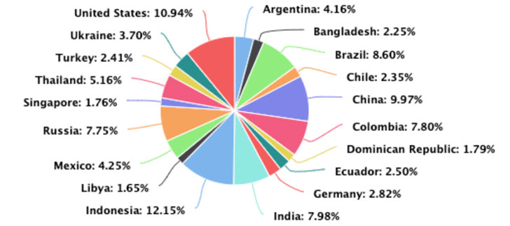 The top sources of the attacks came from Indonesia, followed by the U.S., China, Brazil, India, Colombia, Russia, Thailand, Mexico, and Argentina.