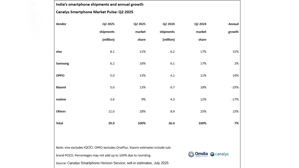 India’s smartphone shipments grew 7 percent year-over-year (YoY) in the April-June period (Q2) in 2025, according to Canalys. The rebound was driven by a wave of new launches, following a cautious first quarter where vendors held back due to elevated inventory levels. Vivo grabbed the top spot in domestic smartphone shipments with 21 percent market share. Samsung came in second place, followed by Oppo. Xiaomi and Realme captured the fourth and fifth positions.